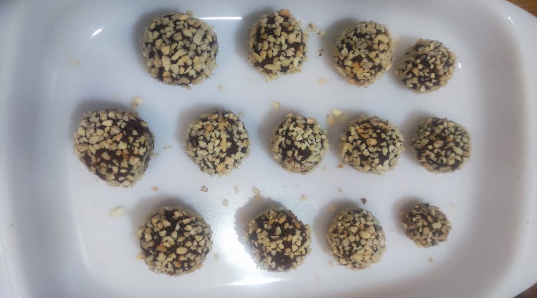 Смешиваем мякоть тыквы с сухими ингредиентами и добавляем столовую ложку воды. Перемешиваем массу и получаем тесто для формирования шариков. Эти шарики мы обваливаем в миндальной крошке и оставляем в холодильнике на 15 минут. Там они немного затвердеют и готовы для потребления.