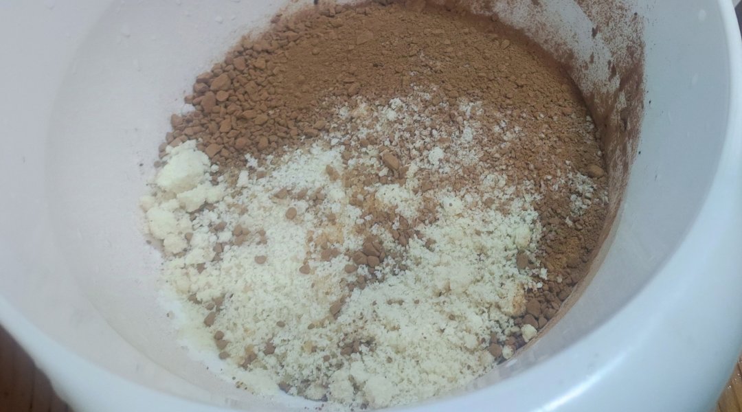 100 грамм миндаля в виде муки смешиваем с сахаром и мукой миндального дерева.