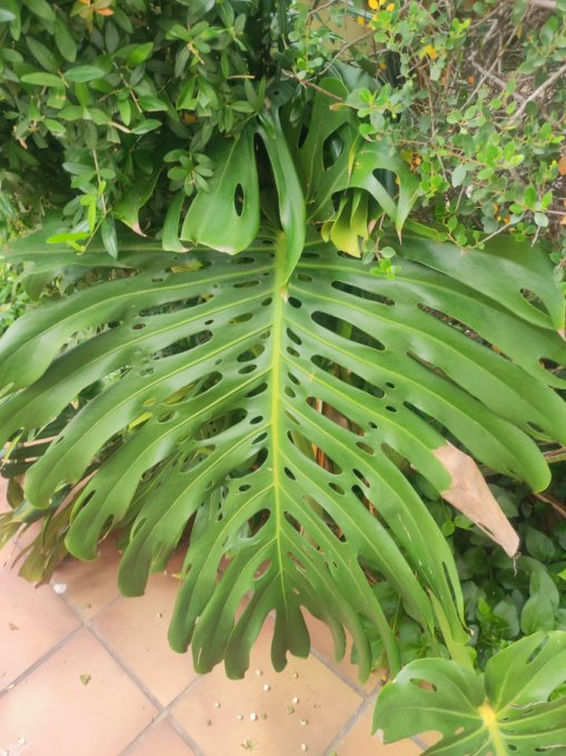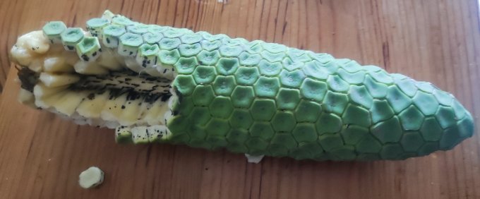 Дело было так: возвращаемся с дочкой с прогулки и видим на дорожке разломанный плод. Надо сказать, я его уже раньше видела на растении, но принимала за бутон. Оно у нас уже цвело. (По- видимому, пару лет назад, но время так бежит!) Я подумала, что наши кошки, охотясь на птенцов воробьев, сломали бутон. Оказалось, нет. Муж подобрал эту штуку и рассказал, что сестра несколько лет назад дала ему это тропическое растение и он его посадил под другим неизвестным мне кустом, так как тропическое растение нуждается в опоре. Называется оно Монстера Делисиоса или Ребро Адама. Оно редко цветет вне тропиков, ещё реже плодоносит, однако вот он наш долгожданный урожай. Плод сам от собственной спелости отломился от плодоножки и упал. Теперь его нужно держать в бумаге и по мере дозревания отъедать от него по нескольку сантиметров мякоти.