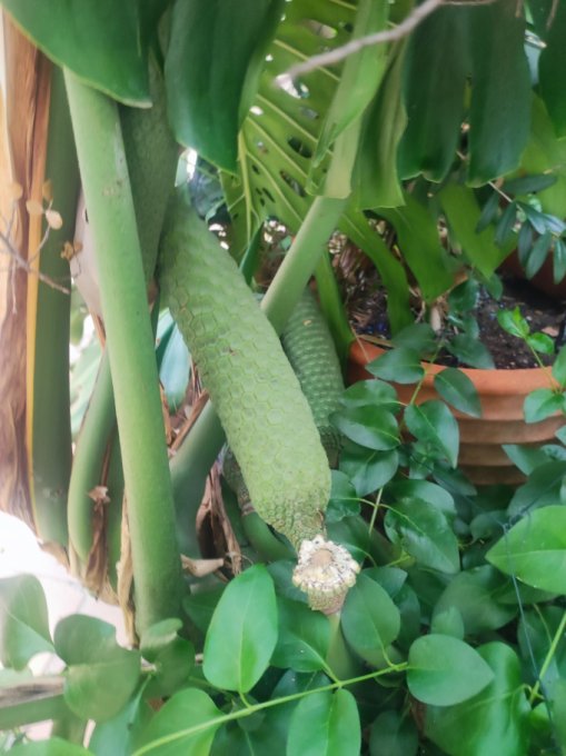 Неведомое доселе мне растение дало очень вкусный плод, который напоминает по вкусу черимойю. Правда, так же как черимойю и манго его не очень легко есть. Нужно зелёную шкуру счистить и оттуда вынуть слой вкуснейшей мякоти. Семечки у плода маленькие и поеданию не мешают.Народное название этого растения "Ребро Адама" из-за формы листьев, а из-за формы и запаха плода его называют "Уксусным хреном", где хрен, который имеется в виду, совсем и не растение. 😉.