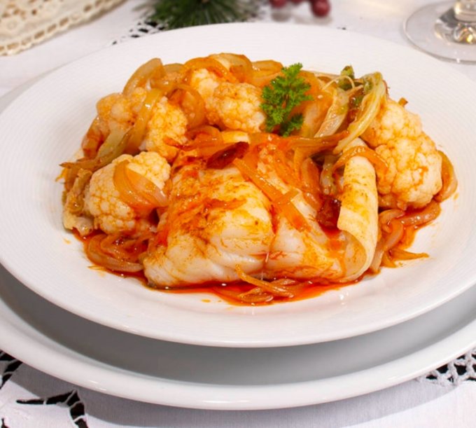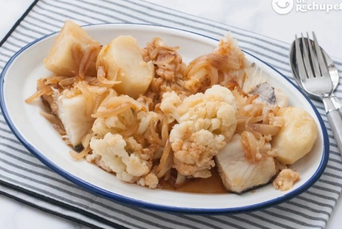 Бывает так, что останется в холодильнике пара случайных продуктов, а нужно готовить обед. Вот и у меня так недавно случилось. Основными продуктами там оказались филе соленой и вымоченной трески, остатки варёных чищенных креветок и большая цветная капуста. Мне такое сочетание ничего не навеяло и я обратилась к поваренным книгам, бумажным и виртуальным. И ... Yes! Традиционное галисийское блюдо (Атлантическая Испания, северо-запад). Семье не стыдно представить: не приготовила из того "шо було" , а вот нам традиция!