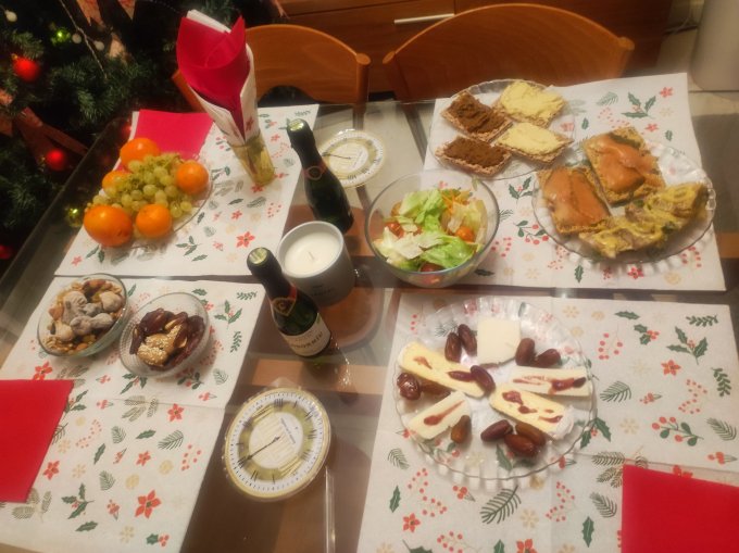 Моя коллекция НГ столов случайно продолжилась. (Праздновали НГ с друзьями виртуально, никто не хотел объедаться, никто и праздновать особо не хотел, причины были). Отнесемся с юмором к фоткам! Фото 1. Стол испанского отшельника, встречающего НГ с нами виртуально : хамон, креветки, устрицы и супейко. Вместо 12 виноградин - 12 ягодок черники.Фото 2. Стол на двоих в Испании (испано-славянский): Салат, хлебцы с паштетами, сыры под соусами из лесных ягод, хлебцы с лососем и холодец под сладкой горчицей. Сухофрукты и фрукты.