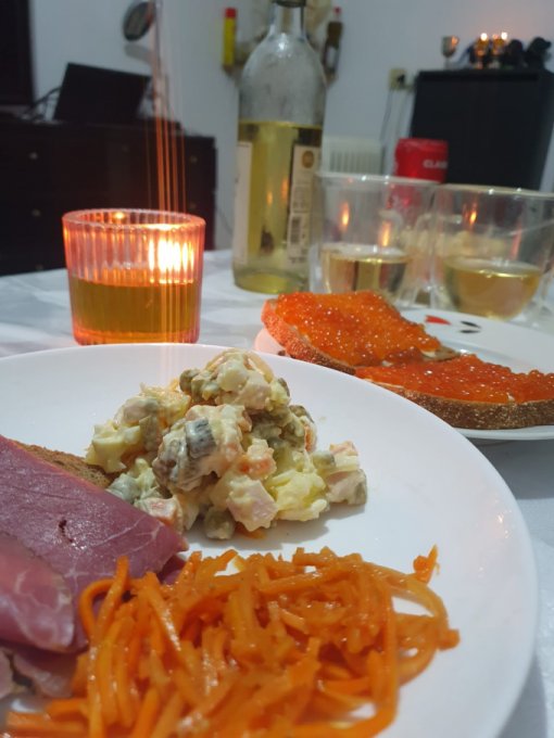 И Фото 3, 4. На первом месте в традиционности - стол в Израиле. Внимание: оливье, корейская морковь, красная икра, красное вино и "Ирония судьбы"! Вот вам и передача традиций, устроителям этого стола нет и тридцати, живут в Израиле со студенческих лет.
