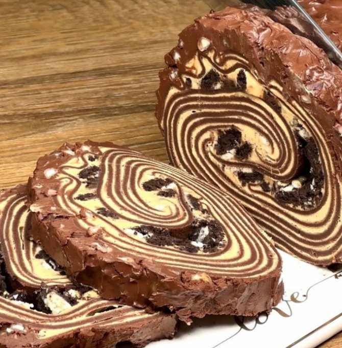 Каждый блинчик посыпаем крошкой печенья, смазываем сырным кремом и вареной сгущенкой (пастой из орехов.) Выкладываем смазанные блины друг на друга и сворачиваем рулет. Рулетик покрываем глазурью: шоколад, сливки и орехи. Ставим в холодильник. Разрезаем на порции перед подачей.