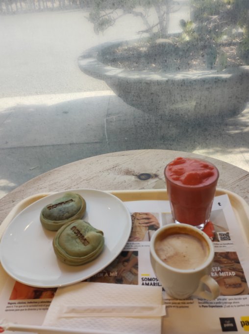 День на веган диете 9. Утро: бутерброды с авокадо и чай. Обед: чечевичное рагу и салат с тофу. Полдник: кофе с овсяным молоком и шпинат в тесте. Ужин: салат с фасолью. Активность: походы по делам пешком по городу 8 км. На фото: полдник с дочерью. Наши пирожки со шпинатом, мой кофе и её смузи из клубники. Город: Барселона, "Зона Альта", сегодня. Зона Альта: часть города вдали от моря, на холмах, не туристическая, жилая. Дорогая для проживания.