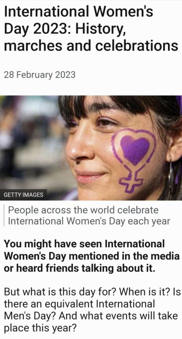 Не везде этот день выходной. Но отмечают везде, где не запрещено. (У талибан, вряд ли ... Мрачная шутка ) В школьных и университетских программах по всей Европе, так как мы ориентируемся на один организм, уже не первый год обязательны темы, посвященные роли женщин абсолютно в любой сфере жизни. Это не воспитательные часы, а интеграция в предмет. Какую бы тему не освещал, всегда обязателен вопрос, а что женщины сделали в этой сфере? А какова роль женщин в этом? Кроме того, 8 -му марта посвящены дни и недели близкие к этой дате. У нас в школе идут уроки только об этом на всех отделениях. Вчера, сегодня и завтра. Сегодня в Испании всеобщая забастовка, чтобы народ, кто хочет, пошел на митинги, в парламенте идут дебаты. В других странах похоже. Ниже поздравления.