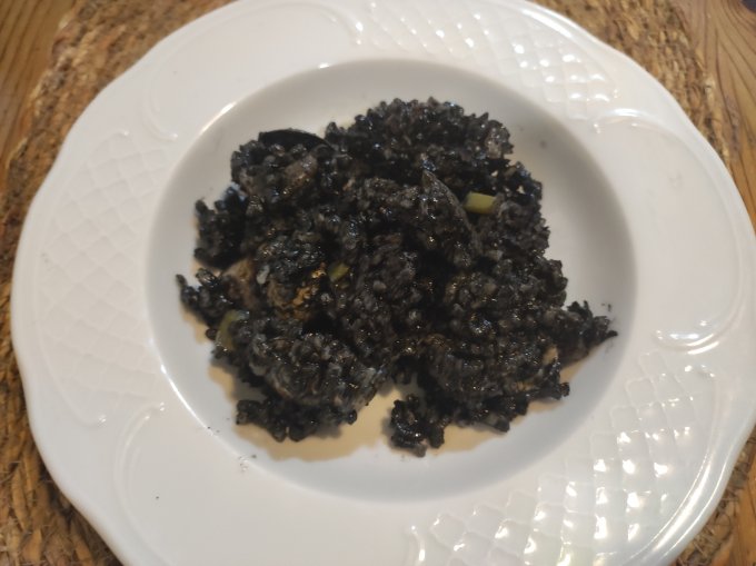 Рис был белым. Белый рис с каракатицей и ракушками. Черным он стал от чернил каракатицы. Вот такой у нас сегодня обед от мужа. Поэтому не знаю, как считать и как вносить в дневник...Но всё-таки это и красиво и вкусно, по -моему. Состав: рис, морепродукты, зелёный итальянский перец и лук, масло оливковое.