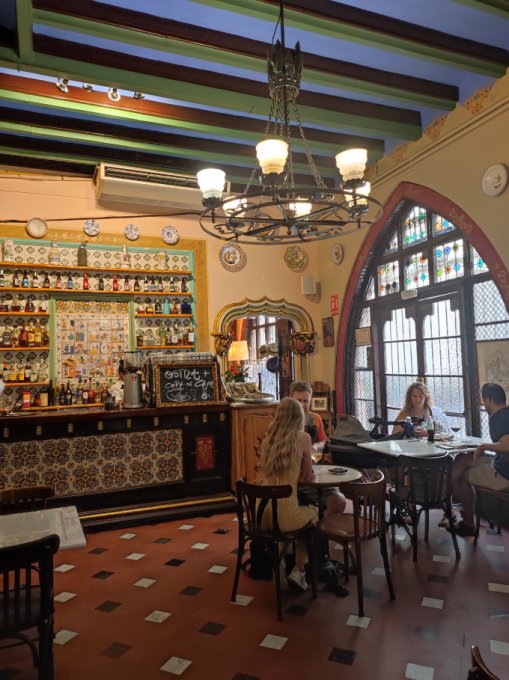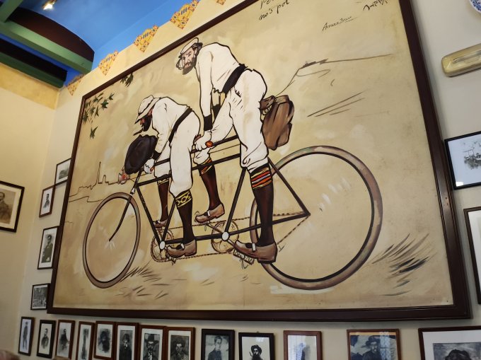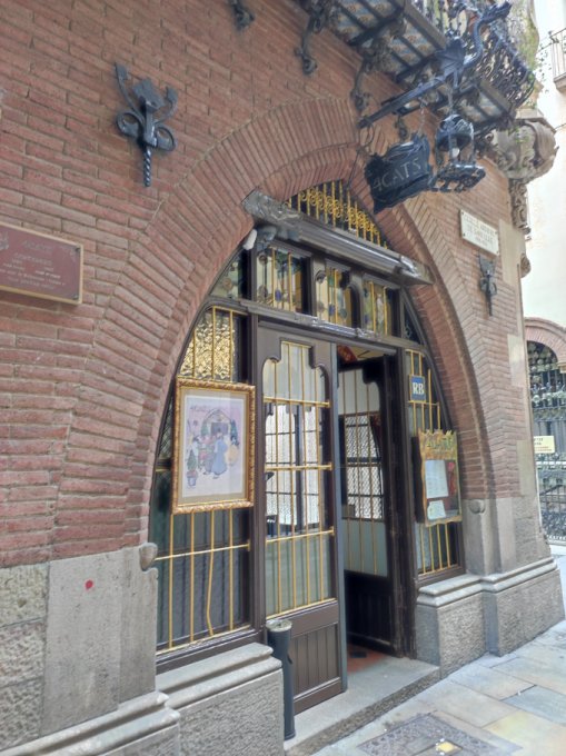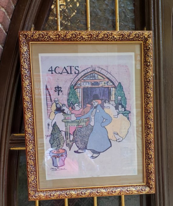 Дочь ждёт друзей, которые хотят посетить Барселону, и поэтому поводу мы заглянули сегодня в особое место: Старинный ресторан "4кота". Коты в ресторане не водятся. По -каталански это выражение означает группу людей незначительного количества , то есть посетителей в этой таверне "Кот наплакал". Ну насколько хватает мне русского языка, я бы назвала таверну "Междусобойчик" . Знаменита эта таверна тем, что она возникла в самом конце 19 в. с идеей встречаться там людям от искусства, представителям, модернизма , арт нуво..Тут.