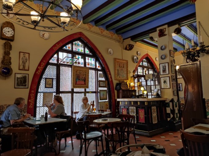 , среди многих, часто сиживали Гауди и Пикассо. Сейчас это ресторан местной кухни, пивная и кафе в самом центре Барселоны. Хорошее место вкусить с искусством какое-нибудь традиционное блюдо или просто выпить вина с ассортиментом сыров. .