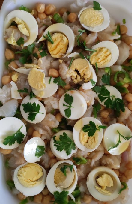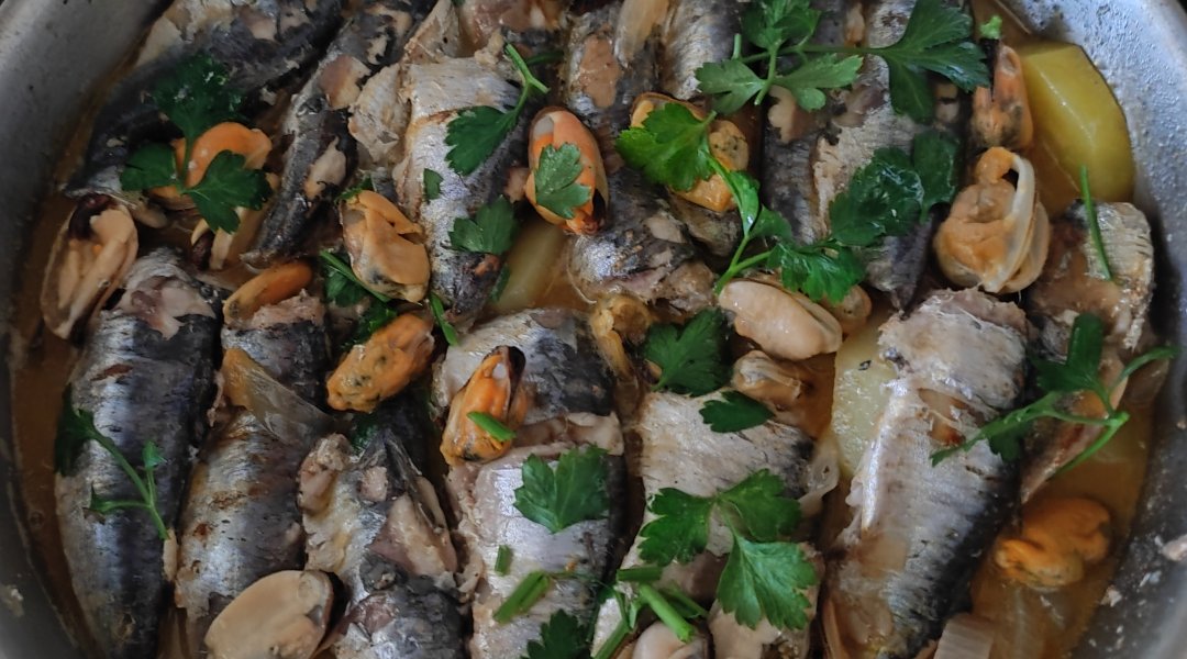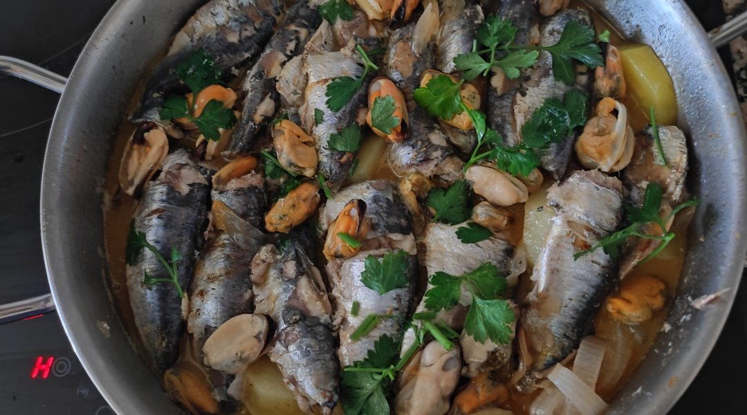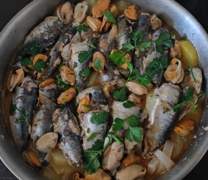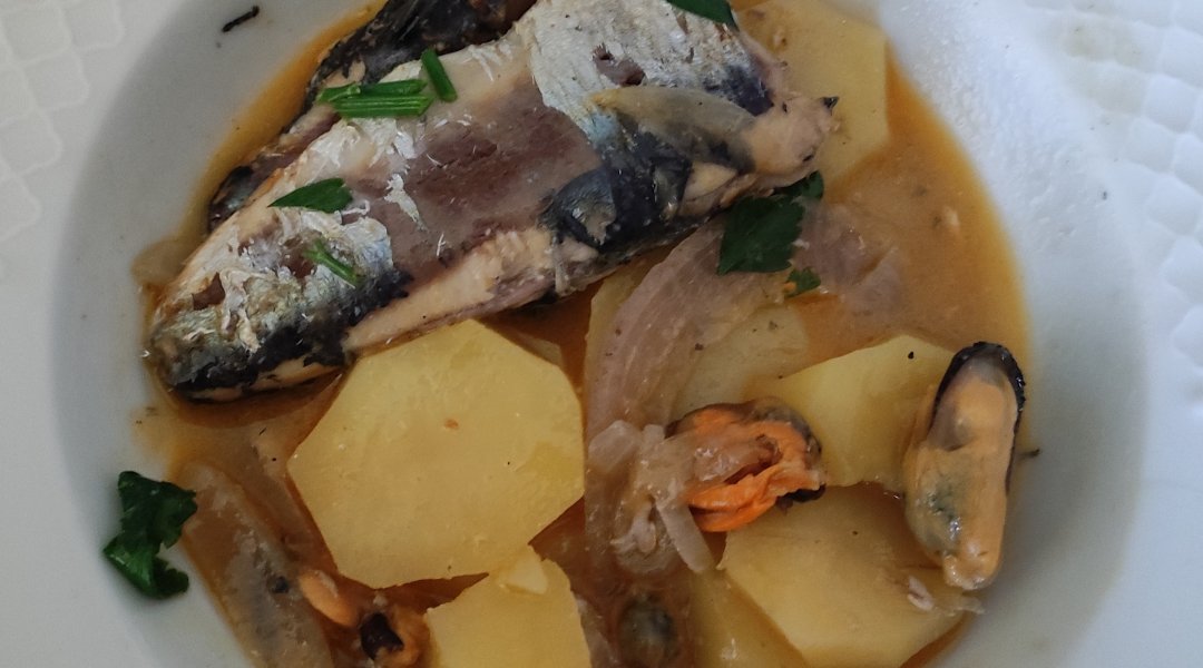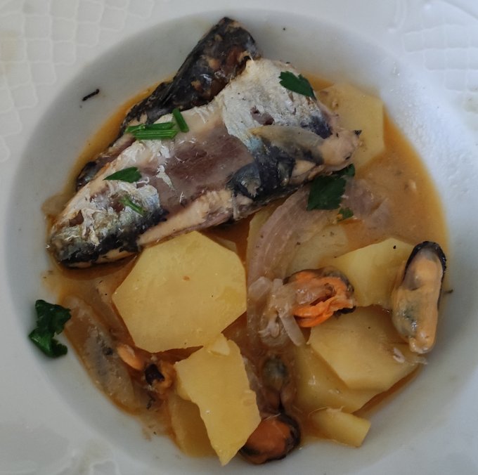 Так вот получилось сегодня 1. Холодная закуска: треска с турецким горохом, 2. На горячее: кальдейрада из сельди, мидий и картофеля. 3. На десерт: черный шоколад и чай.