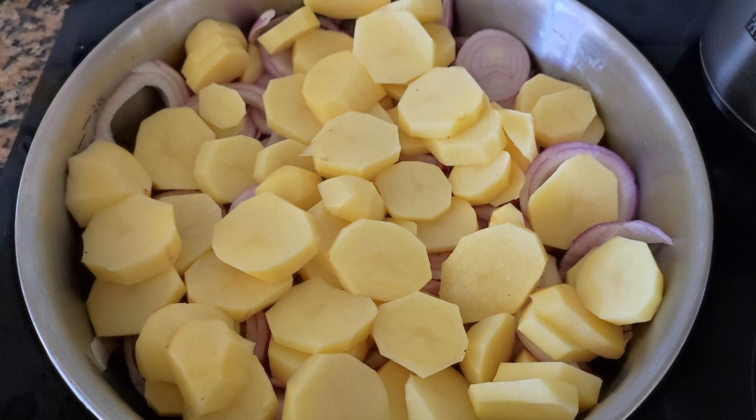 Лук и картофель порезать кольцами и выложить слоями в широкой и плоской посуде,традиционно в глиняной. Посолить и поперчить черным и красным молотым перцем.