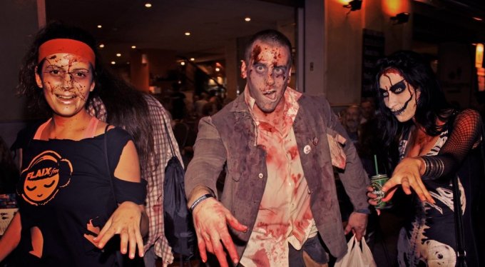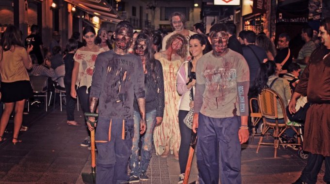 Живу рядом с городом Ситжес, где ежегодно проходит фестиваль фильмов ужасов или фантастического кино. Сейчас он как раз в разгаре. Обязательное мероприятие фестиваля - это парад зомби. Все желающие поучаствовать приглашаются на макияж, а потом отрабатывай, ходи по городу и рекламируй фестиваль. Внизу доковидные видео.