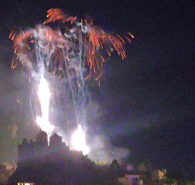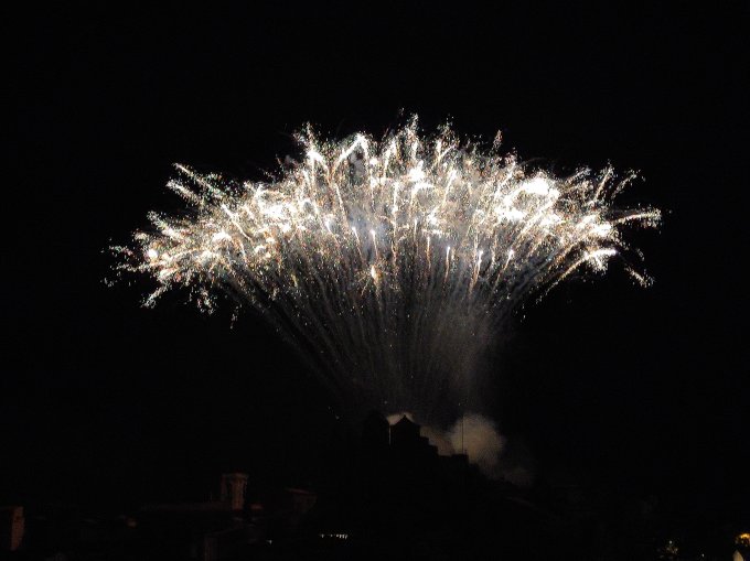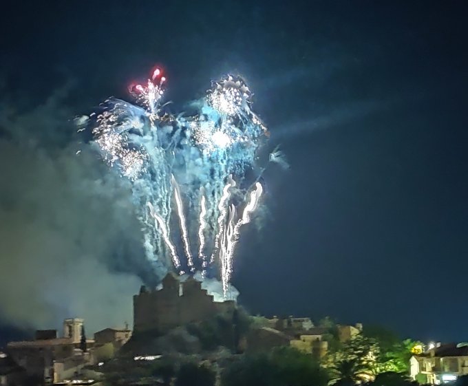Дьявольский танец с огромными бенгальскими огнями в несколько метров -это каталонская традиция. В городе гасят уличное освещение и группы дьяволов идут парадом под гром барабанов. Хлопушки, световые ракеты и прочие устрашающие звуки -это часть представления. До и после дьяволов идут полицейские и пожарники... Вчера, после гастрономической засады во время прогулки нас ещё ждало и это препятствие. Мы домой добрались без повреждений. Желаю, чтобы у всех и всегда выстрелы и огни были бы только салютом, частью веселого праздника!