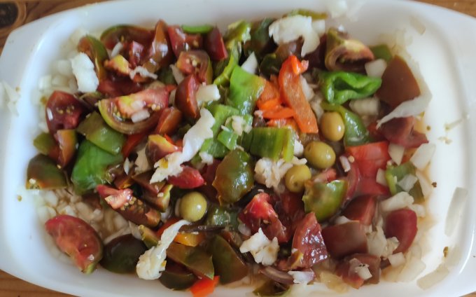 Сегодня вхожу в лучшие рационы благодаря салатикам. Делюсь салатом из солёной трески с луком, помидорами и оливками. В классическом рецепте больше ничего и не нужно, кроме масла и лимона, либо уксуса. А у меня ещё добавлен перец пассированный сладкий, красный и зелёный.