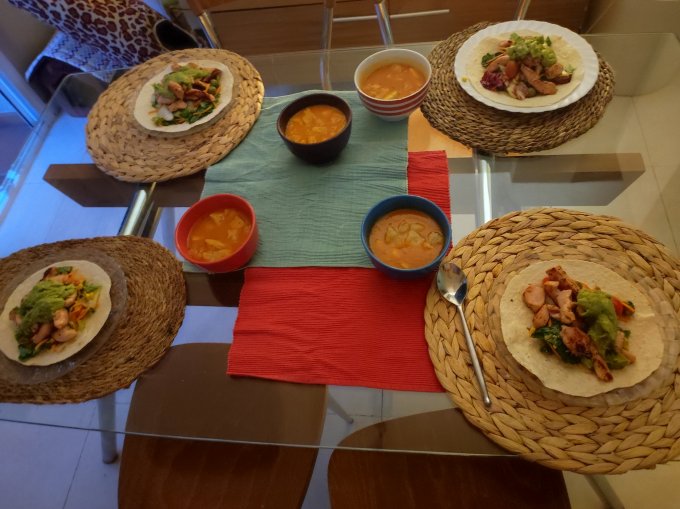 Ждали гостей и муж так расстарался, ну как можно было отказаться? На профицит не вышла, но и дефицита не оказалось. На первое был гаспачо с хлебом, как дедушка любил, а на второе тако с курицей и гуакамоле. На третье был шоколадный мусс, но я от него воздержалась. Вместо этого сходили на полуночную прогулку. Днём у меня была маленькая велотренировка, только поэтому эта ночная объедаловка вместилось в рацион.