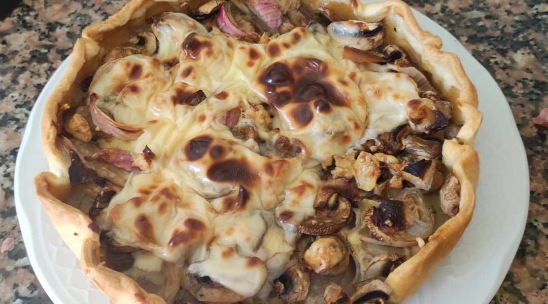 Заполнить желаемым наполнителем. У меня сегодня четыре маленькие луковицы, половина пакета шампиньонов, два яйца и три листочка сыра для сэндвичей . Несколько грамм сыра Блю тоже пошли в пирог. Его не нашла в основной базе и для счёта калорийности просто увеличила количество другого сыра.