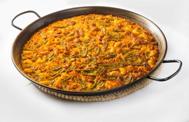 Паэлья подается в сковороде, в которой она готовится.