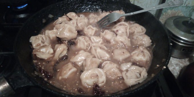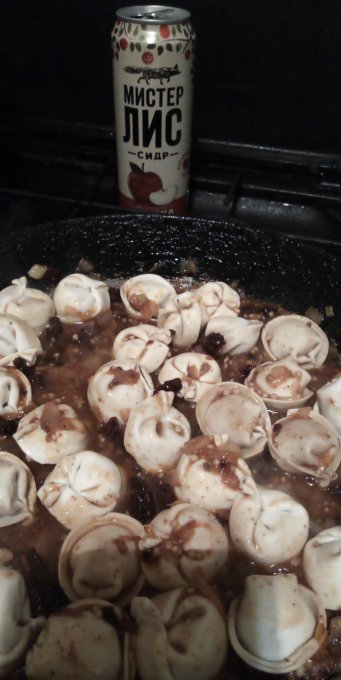 И так, на сковородку сливочное и подсолнечное масло, мелко чеснок, далее поджариваем лук, открываем баночку с синдром яблочным, делаем хороший глоток. Вздыхаем и выливаем на сковородку грамм 100-150 сидра, высыпаем пельмени, перемешиваем, что бы все это у нас привыкло друг к другу, солим, добавляем паприки, специй любимых, вместо соли соевый соус, тем временем сидр закипел, доливаем воды, что бы залить выглядыаающие пельмени, накрывает крышкой и тушим, время от времени помешивая, что бы не слипались. В итоге наши пельмешки оказываются в таком густовато-жидком соусе с оригинальным вкусом.