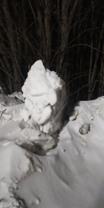 А фотку седня ночью сфотал.. Некий лик, ну как на Марсе, известный "сфинкс"... Там камень и игра света, а тут снежная скульптура.