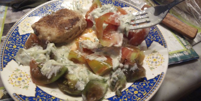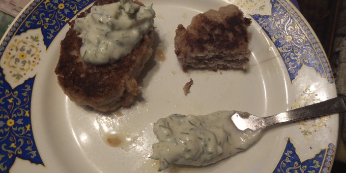 Нашёл интересный соус. Подходит и для салатов, и для котлетки, и для картошки отварной. А вот с котлеткой немного не того, начало было классным, обнаружил раскрытую пачку овсяных хлебцов, ну, такие толстые, круглые, они и так то жестковаты, а тут стали очень жёсткими,  решил их перемолоть в измельчителе, как сухари, и добавить в фарш. Получилось очень интересный вкус, но я решил "улучшить" и добавил льняную муку, всего то 10 грамм, и всё ради Омега-3, а  получилась такая бяка! ! Но что делать, придётся есть, есть и давится, иного у меня на двое суток не предусмотрено..
