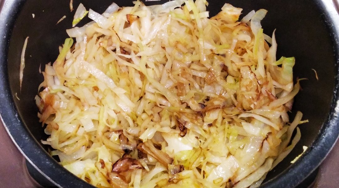 В чашу мультиварки налейте подсолнечное масло, положите нашинкованную капусту и спассеруйте еë на режиме "Жарка". Помешивайте, пока капуста не приобретëт приятный коричневый оттенок. Он придаст цвет готовому блюду, и вкус получится интереснее, чем от обычного тушения.