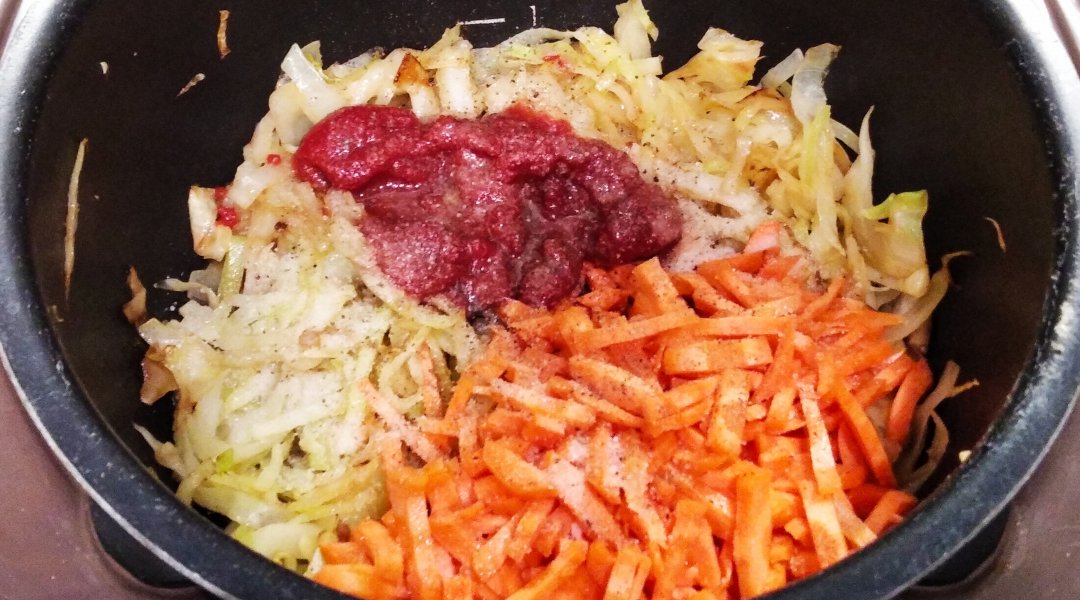 Добавьте к капусте морковь, томатную пасту, соль, молотый перец и воду. В мультиварке вода почти не испаряется, и я не люблю много жидкости в капусте, поэтому беру стакан воды. Хотите больше бульона - возьмите больше воды.
