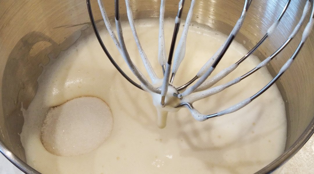 Взбить яйца в густую шапку, постепенно добавляя сахар. Должна получиться пышная белая кремообразная масса. Рекомендуют взбивать белки отдельно от желтков, но планетарный миксер (моя прелесть!) справляется и так.