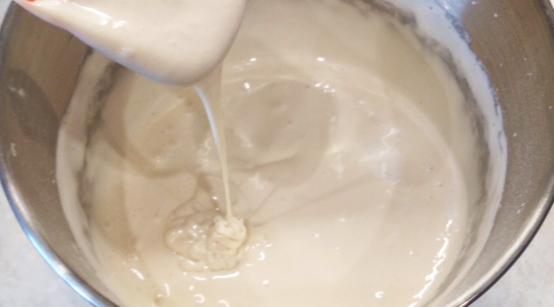 Муку смешайте с яично-сахарной массой. Рекомендуется смешивать аккуратно венчиком или лопаткой, но я предпочитаю миксер. Нужно получить равномерное негустое кремообразное тесто.