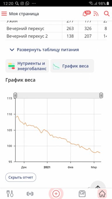 109 кг ,сегодня 97,8,мне 65 ,хожу с тростью ,график как горка с