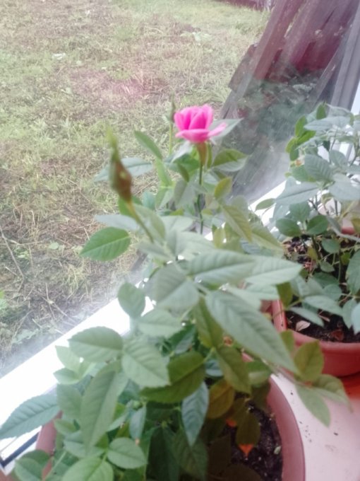 И еще у меня есть одна прекрасная новость, наконец то зацвела моя розочка))) Я ее несколько недель назад спасла так сказать))) Мы по дороге на работу постоянно заезжаем в один и тот же круглосуточный магазин «Магнит» и вот  там на подоконнике  стоит куча цветок разных, состояние у них конечно, стой и плачь ну, а что ожидать, за ними там явно не смотрят, не поливают(((  и вот в кучи этой цветок, я разглядела горшочек с розой, состояние у нее было печальное, листья пожелтели, часть осыпалась, половина стеблей просто засохли, бутоны все завяли, короче жалко((( я смотрела на нее честно несколько дней, ценник был довольно таки непривлекательный 499,99 рублей, за что???  через пару дней цена стала 299,99, мда ужжжжж, еще через пару дней ценник вообще куда то делся… я подошла к продавцам и спросила