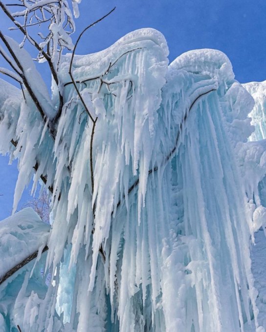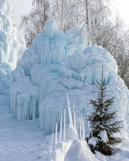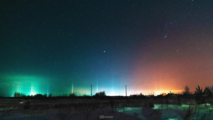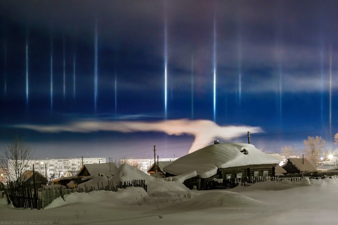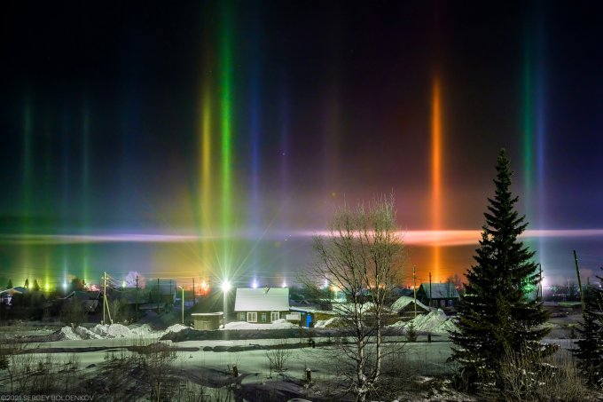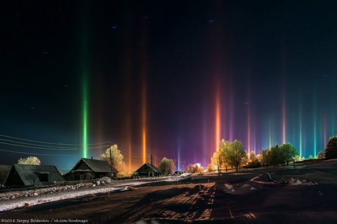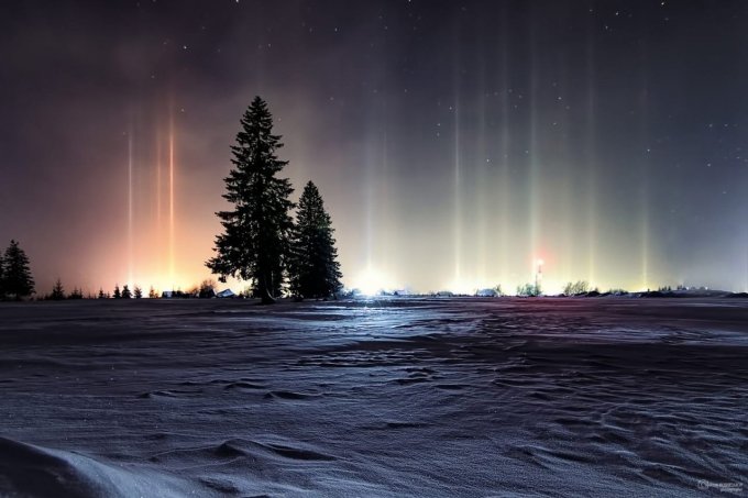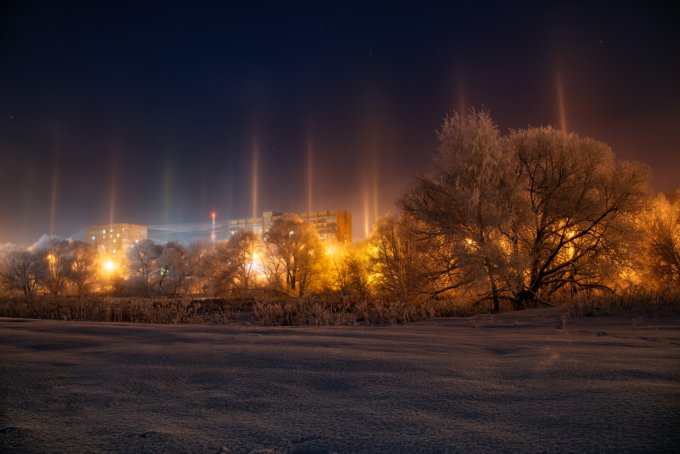 Несколько дней назад в посёлок Тёплая Гора Пермский край  пришло резкое и кратковременное похолодание — уже после полуночи температура воздуха опустилась до отметки –30°С. Одновременно с арктическим вторжением в посёлке засияли световые столбы — условия погоды для них практически до самого утра были крайне благоприятными: мелкие парящие ледяные кристаллы отражали свет уличных фонарей и заставляли небо сиять красочным световым «лесом» — он исходил от самой земли, зависал в воздухе, светился разными цветами, растворялся в морозной дымке и появлялся вновь.. Даже несмотря на тридцатиградусный мороз, этой игрой кристаллов на свету можно было любоваться очень долго.