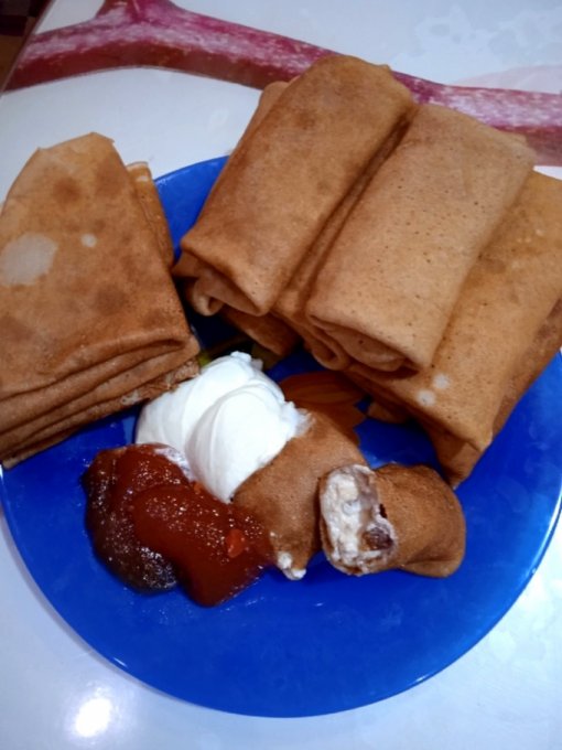 Сегодня пекла мужу блины на рассоле, может кому -то понравится. Рассол можно брать любой, у меня огуречный ...если очень крепкий,то развести водой. Мука у меня наполовину с ржаной, можно и любую другую (льняной, гречневой, кукурузной и т.д.)Сковороду первый раз смазала постным маслом. Такие блинчики можно фаршировать печенью с кабачками, а у меня с творогом, изюмом и бананом.