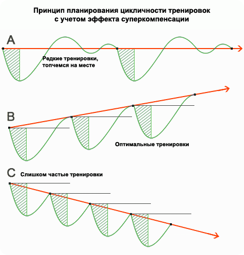 Длительность одного занятия не должна превышать 1 час. Время между подходами - 1-4 минуты. Между тренировками для определённых групп мышц должно быть не менее 72 часов. На каждой тренировке происходит разрушение мышечных волокон, истощение ключевых нутриентов и, конечно, утомление. Это ведет к падению функциональных возможностей. С этой отправной точки ваш организм будет восстанавливаться, увеличивая синтез мышечного протеина для перестройки мышечной ткани, подтягивая вас к исходному уровню так быстро, как только возможно. Если восстановление проходит нормально, наступает период суперкомпенсации, во время которого ваши функциональные возможности превосходят исходный уровень. Это значит, что ваши мышцы растут быстрее, чем раньше. Слишком частые тренеровки одних и тех же групп мышц замедляют скорость их роста.