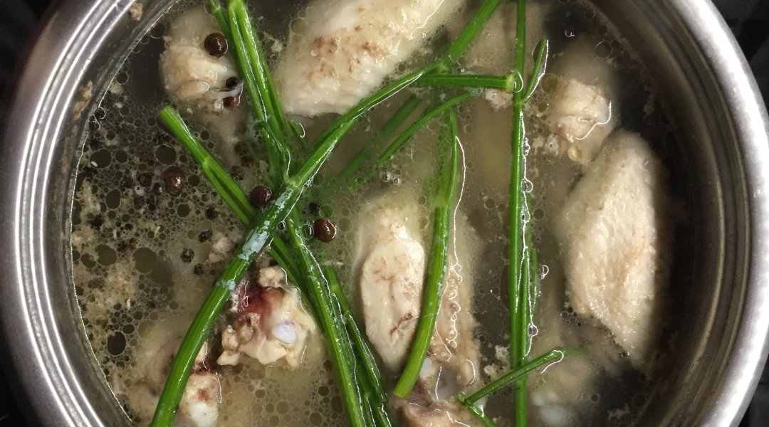 Заливаю курицу водой, довожу до кипения. Снимаю шумовкой пену. Добавляю перец (чёрный и душистый горошек), веточки укропа, немного соли. Варю на медленном огне около 1 часа (практически томлю).