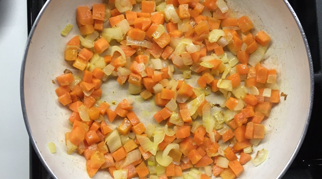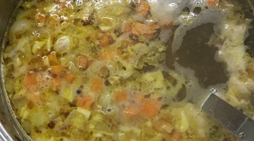 Куриное мясо выкладываю обратно в кастрюлю. Туда же пассированные лук, морковь, мелко порезанный чеснок. Довожу до кипения.