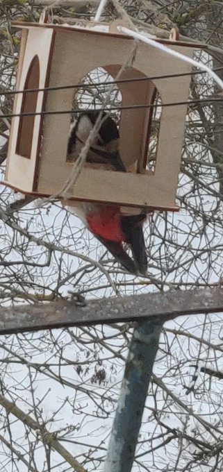 В кормушку для синичек повадился прилетать пестрый дятел , ест