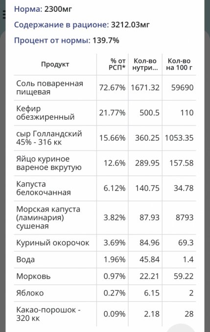 (Я добавляю в рацион 2,8 г соли, и у меня более 128% хлора уже в рационе, так как даже овощи хлор содержат. Я соль больше не употребляю вообще. Она ещё есть в сыре, но сыра у меня всего-то грамм 30. Поэтому странно, как вы хлор не набираете).