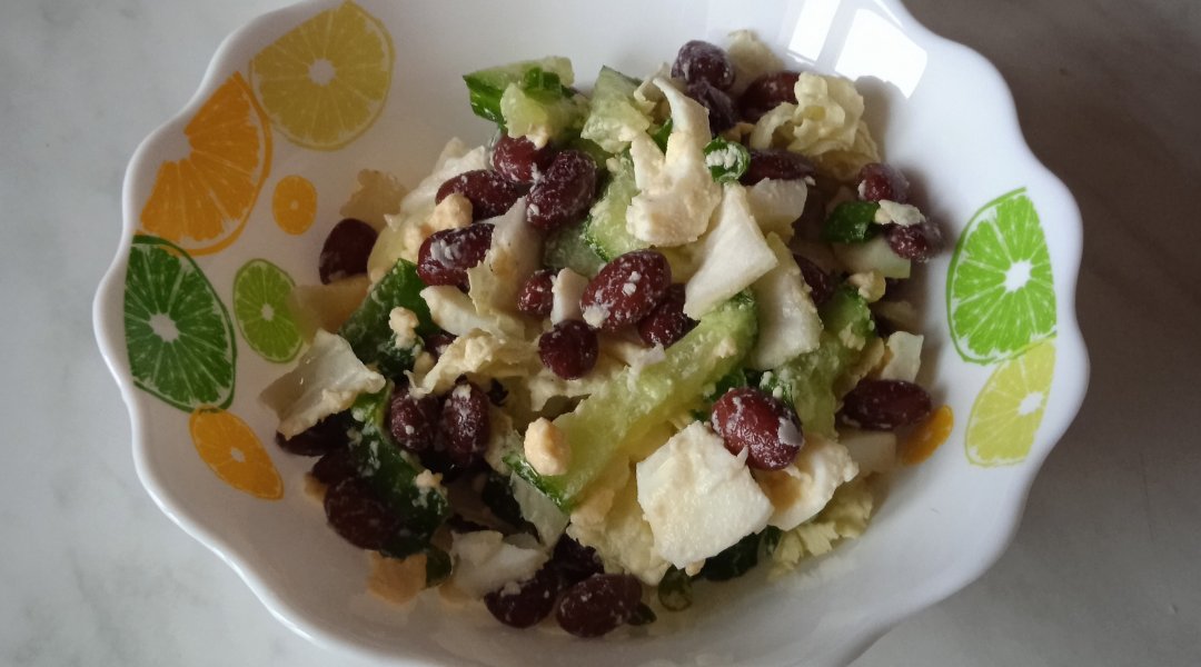 | Салат с огурцом, яйцом,зелёным луком ,фасолью и пекинской капустой |