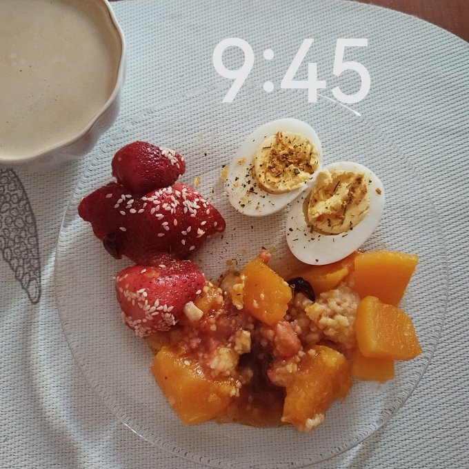 смесь (кунжут, орехи). Яйцо. Кофе с безлактозным молоком.