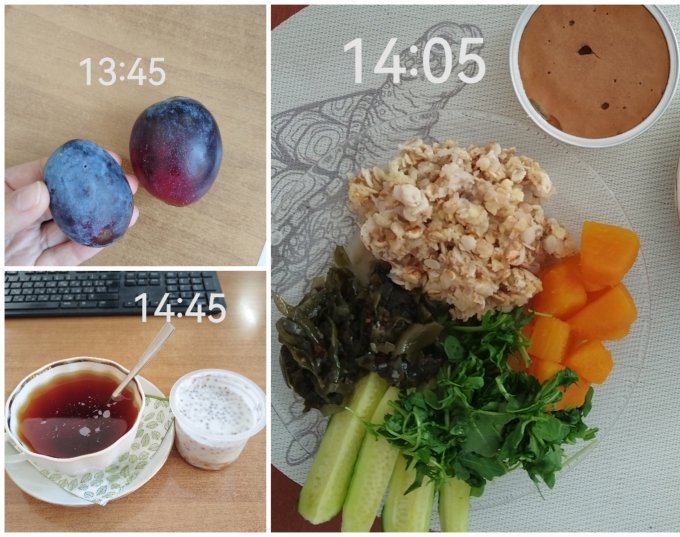 Обед через 4 часа. Фрукты за 20 мин до обеда. Хоть я и наелась, но очень хотелось десерт! В итоге я его съела с цикорием))