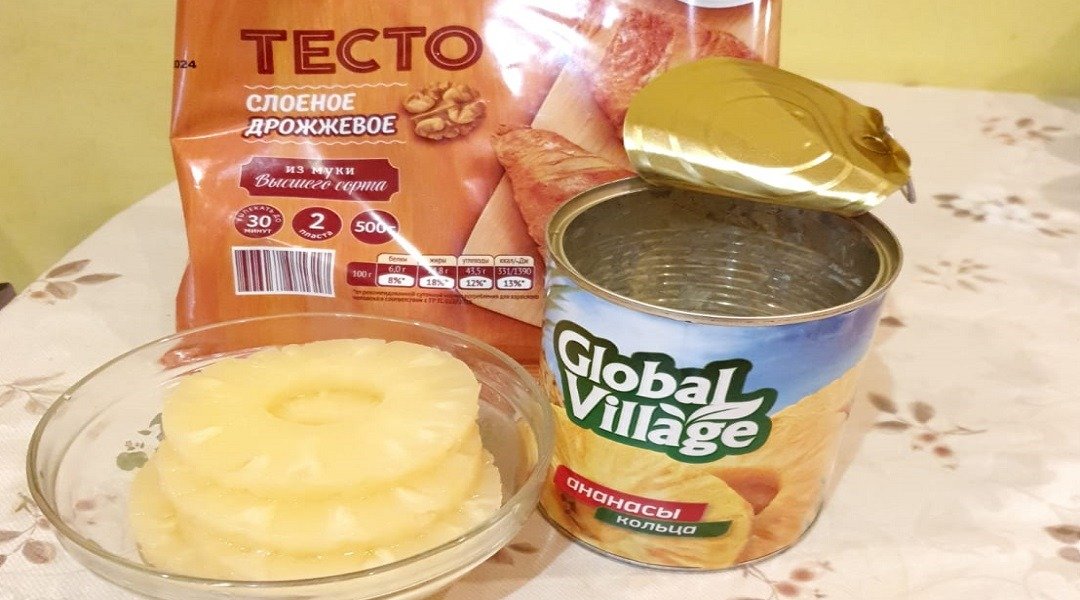 Нам понадобится упаковка слоеного дрожжевого теста 500 грамм и банка консервированных ананасов кольцами. Тесто разморозить в холодильнике . 6 колец ананасов извлечь из сиропа, дать сиропу стечь и разрезать кольца пополам.