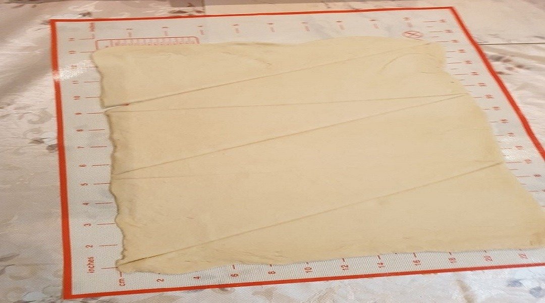 Стол присыпать небольшим количеством муки и раскатать пласт теста как можно тоньше.Затем разделить на 3 прямоугольника , каждый из которых разрезать по диагонали. Также поступить со вторым пластом теста. У Вас должно получиться 12 треугольников