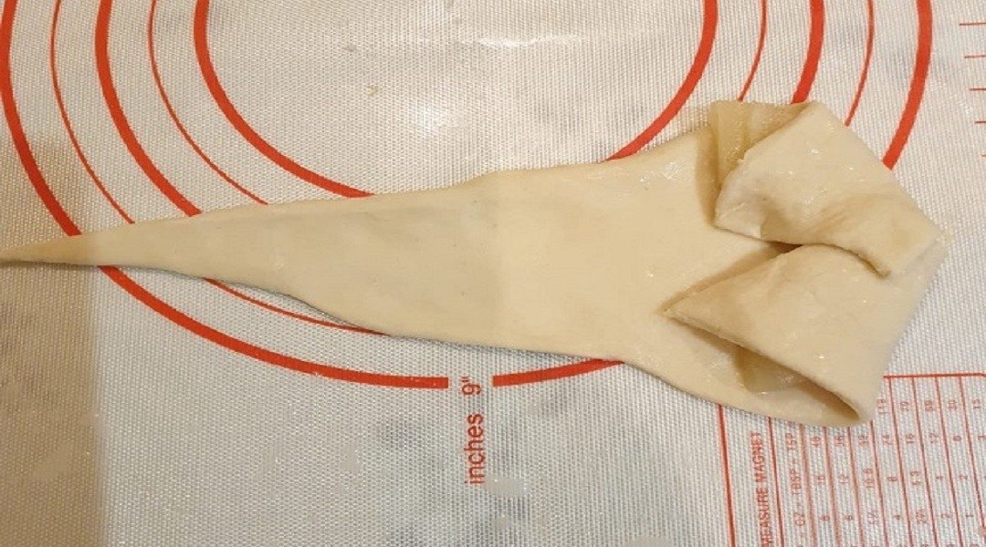 Каждый треугольник надрезать с короткой стороны посредине и сформировать рогалик, завернув в него половинку кольца ананаса