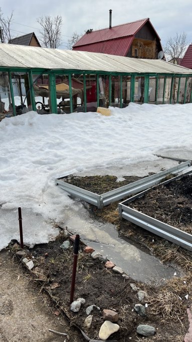 Ездили с мужем на дачу. Убрались в тепличке. Снег ещё лежит.