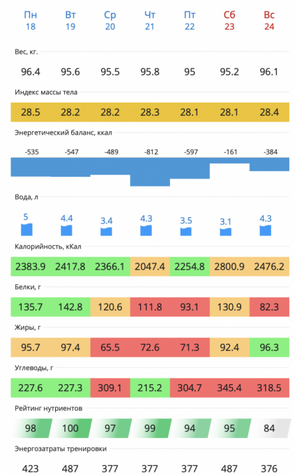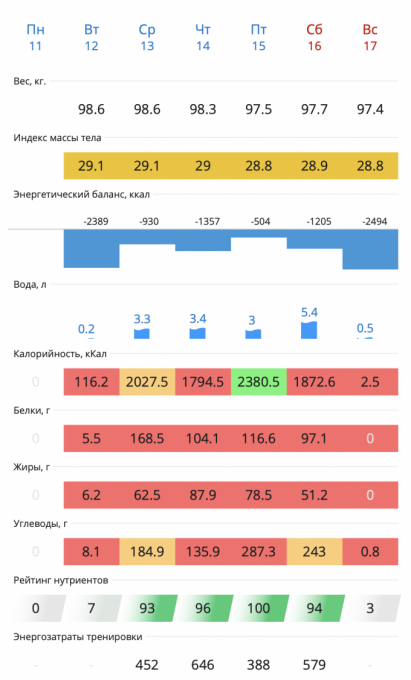 Дневник питания начал полноценно вести со среды, так же как и прием мультивитамин. Питание в течении недели замерялось достаточно точно. Как ни странно, сытость почти всегда была, а вернее легкое чувство голода, но калоража значительно не хватает - все красное.