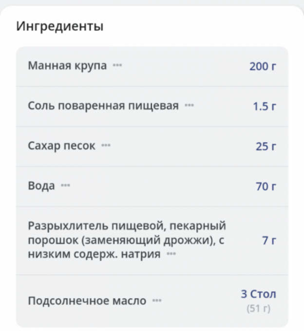А рецепт очень простой. Манная крупа, вода, разрыхлитель, соль,
