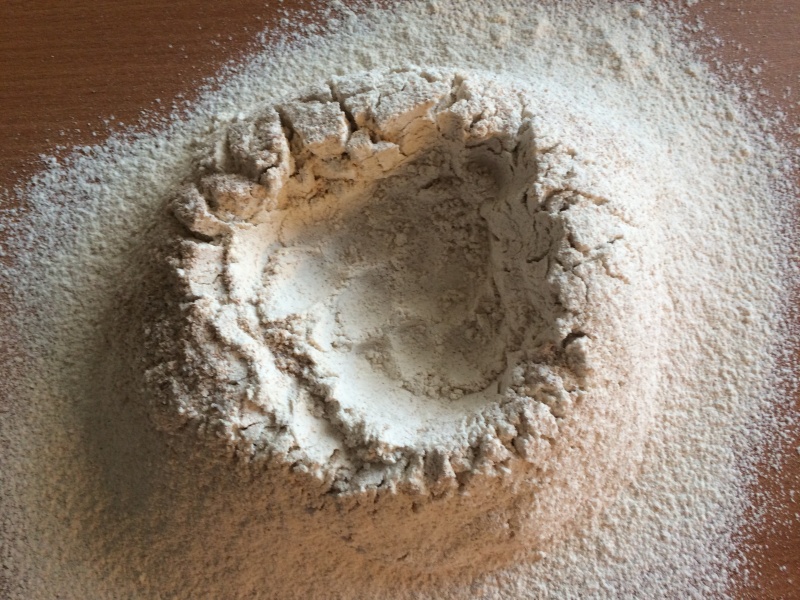 - Оба вида муки и соль просеять горкой на стол, сделать в центре