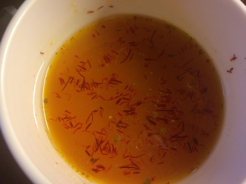 - В миску наливаем немного бульона и завариваем в нем шафран.