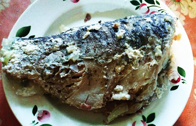 ✅Вообще раньше слышала, что караси вкусные в сметане. Поэтому пришла домой, выпотрошила их, обрезала хвосты и головы (плавники мне ещё в магазине при чистке обрезали), посолила, а минут через 15 смыла лишнюю соль с поверхности, обмазала густой 10% сметаной, дно сковородки тоже, положила туда карасей (как раз два влезли - большой и рядом хвостом в обратную сторону - поменьше, взвешивала их - 600 г уже подготовленных без голов получились), добавила мелко покрошеного лука, молотый черный перец и горошком душистый перец, закрыла крышкой и включила плиту. После того, как сметана закипела, убавила огонь до минимума. Сметаны показалось мало (100 г) - рыбины довольно толстые были и она не доходила даже до половины рыбины, поэтому, чтобы не увеличивать жирность, добавила ещё 100 г 1,5% молока. Минут за 5 до готовности добавила ещё лавровый лист. Получилась такая вкуснятина! Правда, косточек много маленьких.