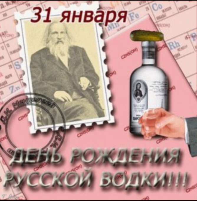 🔹31 января 1865 года русский ученый Дмитрий Менделеев защитил докторскую диссертацию на тему «Соединение спирта с водою» и эта дата почему-то считается Днём рождения русской водки. Крепость 40% в качестве государственного стандарта ввел министр финансов Российской империи М.Х. Рейтерн в 1866 году. В 1894 году российское правительство запатентовало «менделеевскую» рецептуру водки «Московская особенная» как русскую национальную водку. С тех пор водка стала атрибутом праздничного стола.